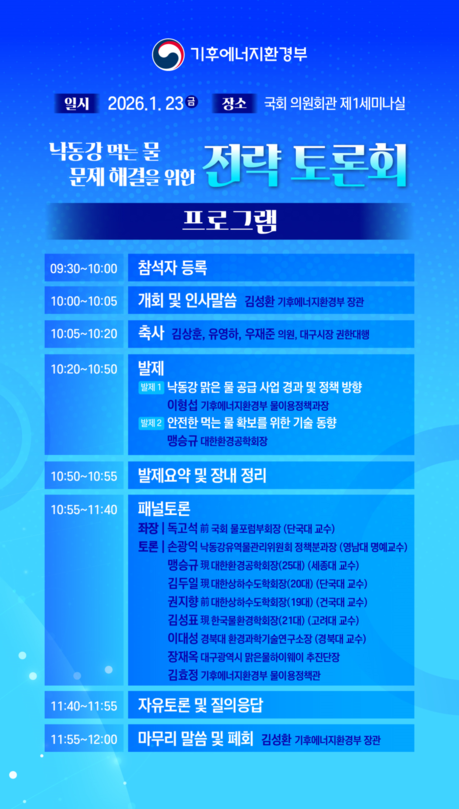 낙동강 먹는물 문제 해결을 위해 기후에너지환경부(이하 기후부) 장관이 전문가들과 대구 물문제 해결의 의지를 밝힌다. 23일 기후부는 국회 의원회관 제1세미나실에서 ‘낙동강 먹는물 문제 해결을 위한 전략토론회’를 개최한다.이번 토론회는 기후부와 국회가 대한환경공학회, 대한상하수도학회, 한국물환경학회 등 국내 물환경 분야를 대표하는 3개 학회와 공동으로 주관하