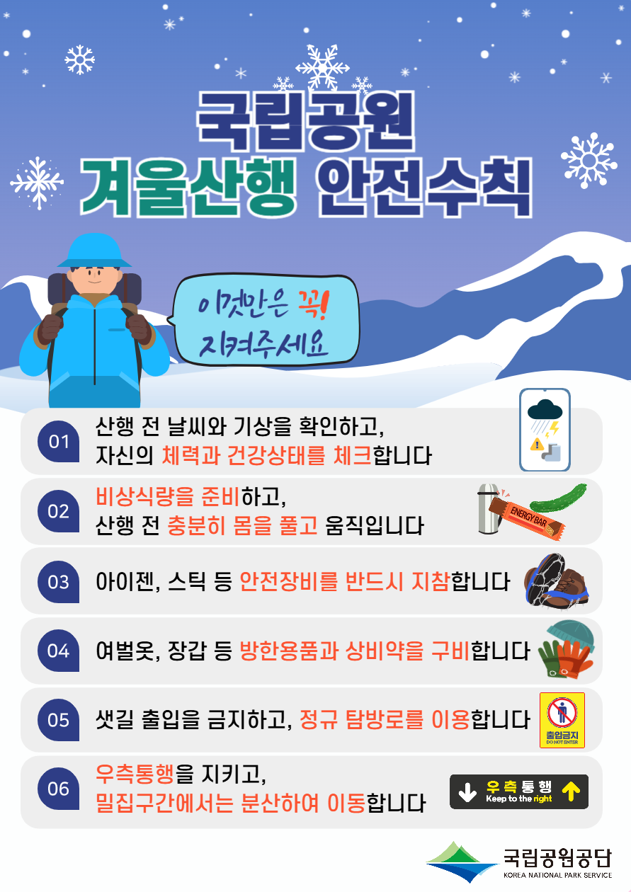 탐방로 주요 입구에 설치된 탐방지원센터 등에 인력을 배치해 아이젠 등 겨울철 안전장비 착용 여부를 확인하고, 정규 탐방로 이용과 우측통행을 유도하는 안전산행 방법을 안내한다. 탐방객이 집중되는 시간대(10~14시)에는 밀집 구간 분산 유도와 함께 샛길 출입, 음주 행위 등을 단속할 예정이다.